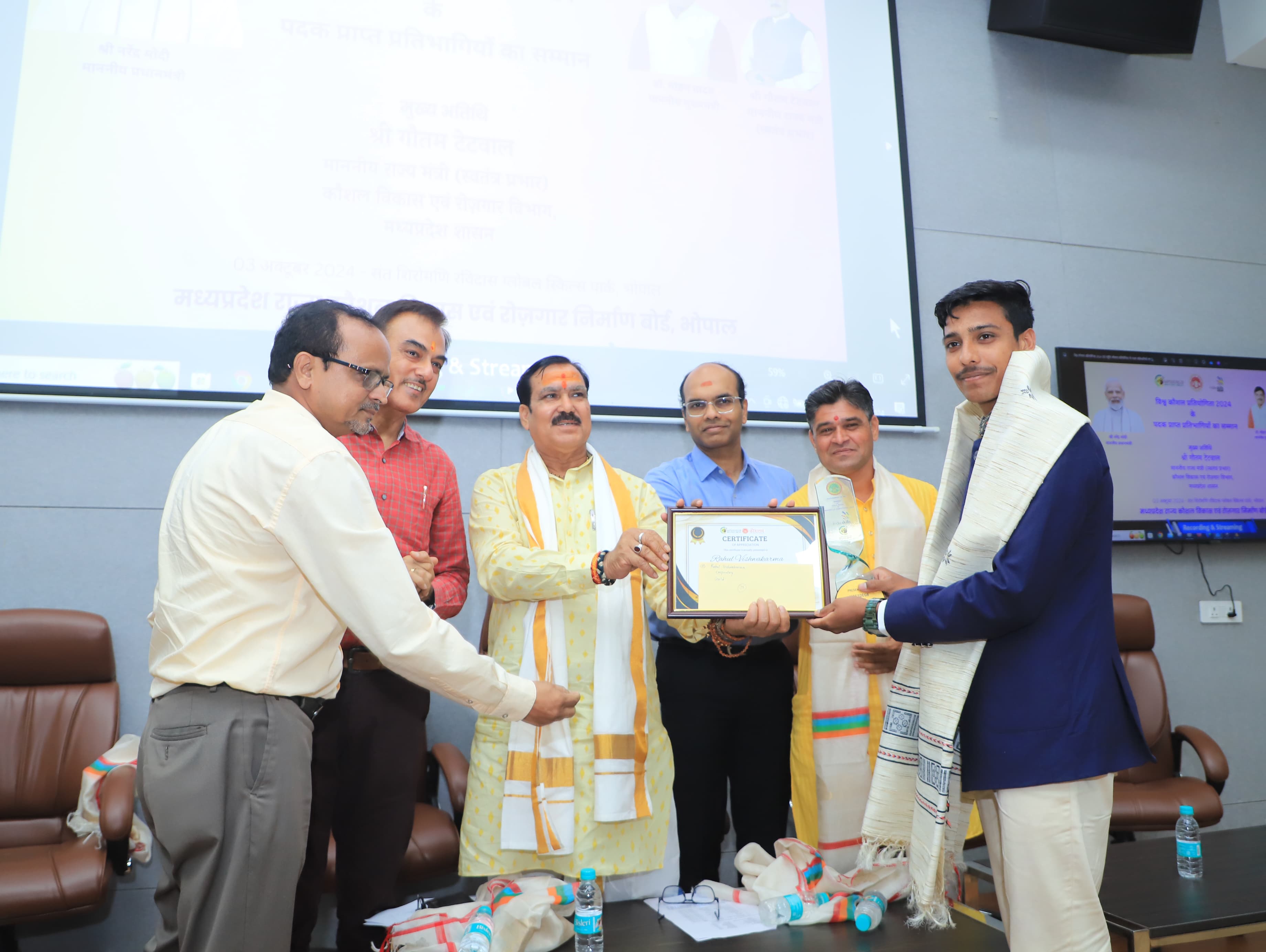 मध्यप्रदेश के प्रतिभागियों द्वारा विश्व कौशल प्रतियोगिता-2024 में उल्लेखनीय प्रदर्शन के उपलक्ष्य में गुरुवार को संत शिरोमणि रविदास ग्लोबल स्किल्स पार्क में एक भव्य सम्मान समारोह आयोजित किया गया। इस कार्यक्रम में कौशल विकास एवं रोजगार राज्य मंत्री (स्वतंत्र प्रभार) श्री गौतम टेटवाल ने प्रतिभागियों को नकद पुरस्कार और प्रशस्ति-पत्र देकर सम्मानित किया।